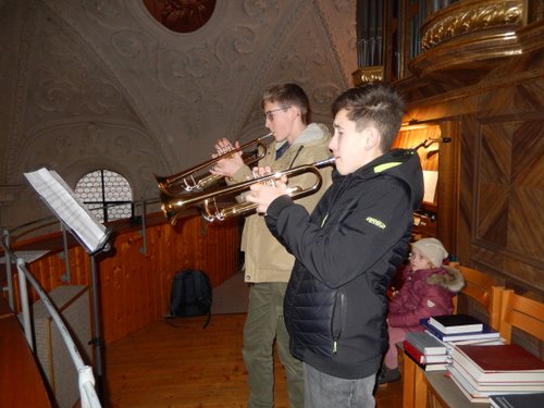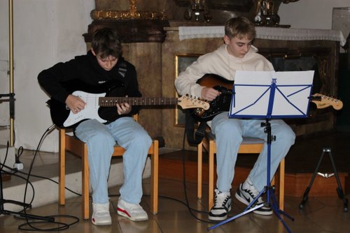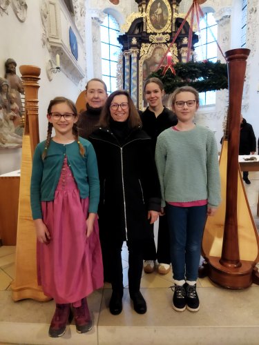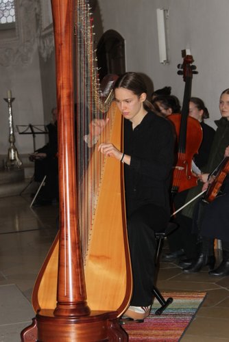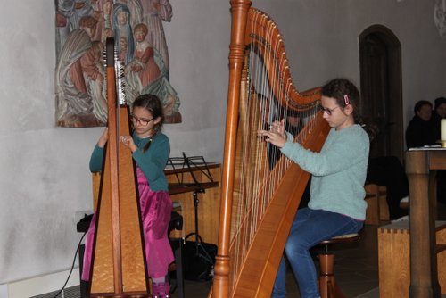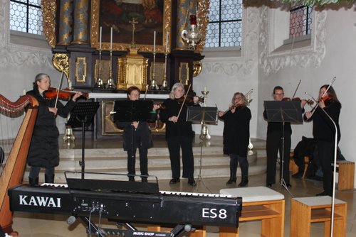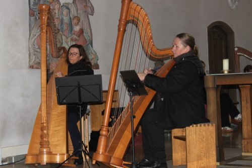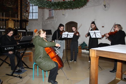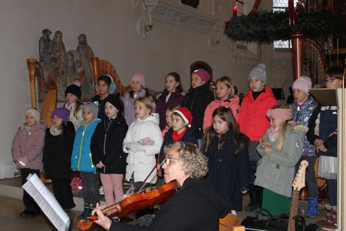 Die Harfe passt wie kein anderes Instrument in die besinnliche Zeit. Andrea Kratzer und vier ihrer Schülerinnen, Annika Giss, Evelina Günther, Sarina Bauer, und Finny Tilp bereicherte das Programm mit zarten und heimeligen Klängen. Genauso berührend zeigte sich der Kinderchor unter der Leitung von Eva Kellermann mit ihren Liedern „Kommet ihr Hirten“, „Welch wundersame Nacht“ und „Leise rieselt der Schnee“. Zum festlichen Rahmen trugen das Blechbläserensemble von Michael Rast, das Trompetenduo und Orgelbegleitung mit Helmut Duschek und Maximilian Koch und das Horntrio mit Sebastian Brenneisen, Maximilian Reiber und Benedikt Berchtenbreiter bei. Die beiden Brüder Ulrich und Paul Sigmund ließen es sich nicht nehmen, mit einem modernen Arrangement von Weihnachtsliedern, auf E-Gitarren ihren Beitrag zu leisten. Einen würdigen Abschluss mit barocker Musik von Händel und Pachelbel bescherte Krystyna Hüttner mit ihren Streicherensembles und das gemeinsam gesungene Lied „Macht hoch die Tür“.